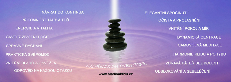 - Mé nejlepší, praxí prověřené, know-how z oblastí fyzioterapie, výuky taiči a čchi-kung, cvičení jógy, šamanských obřadů v Peru, meditací, NLP aj. jsem jednoduše a srozumitelně shrnul do praktického uceleného cyklu HLADINA KLIDU.